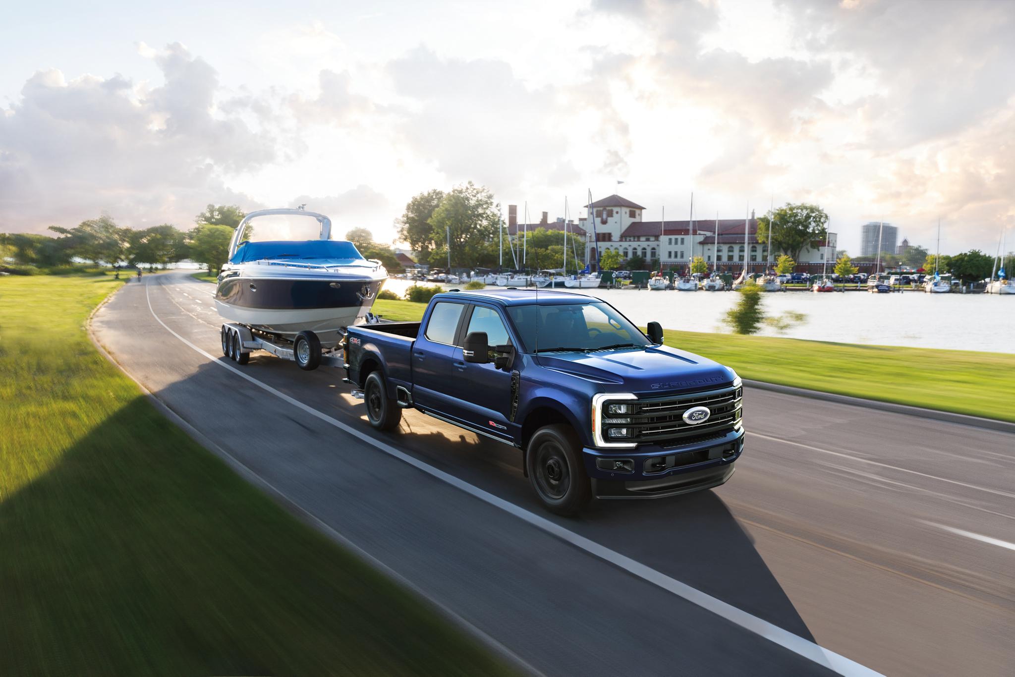 Inside the Ford Super Duty, the available Pro Trailer Backup Assist makes maneuvering with a large trailer more intuitive than ever, even if you're navigating crowded streets in downtown Jefferson, WI. Just turn the dash-mounted knob in the direction you want the trailer to go, and this smart system will steer the truck for you.